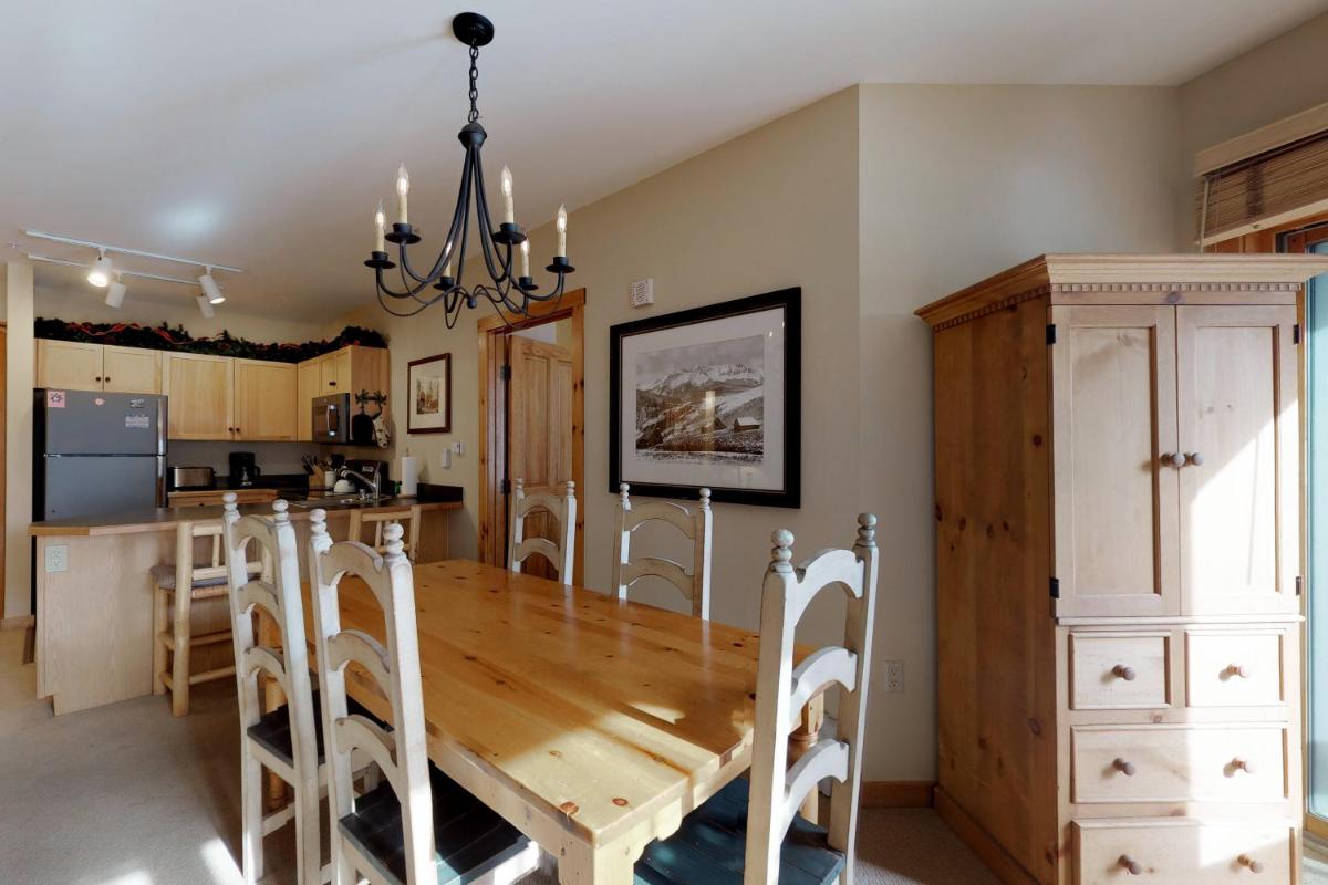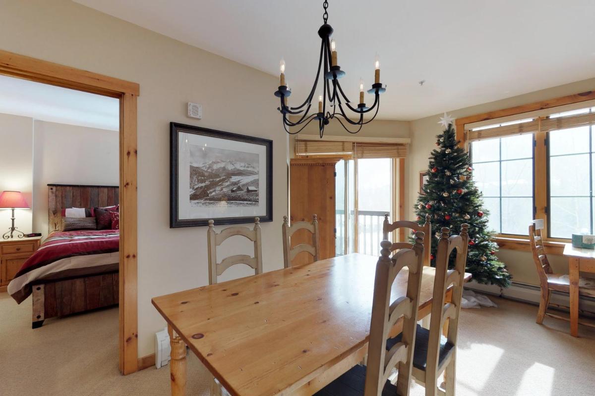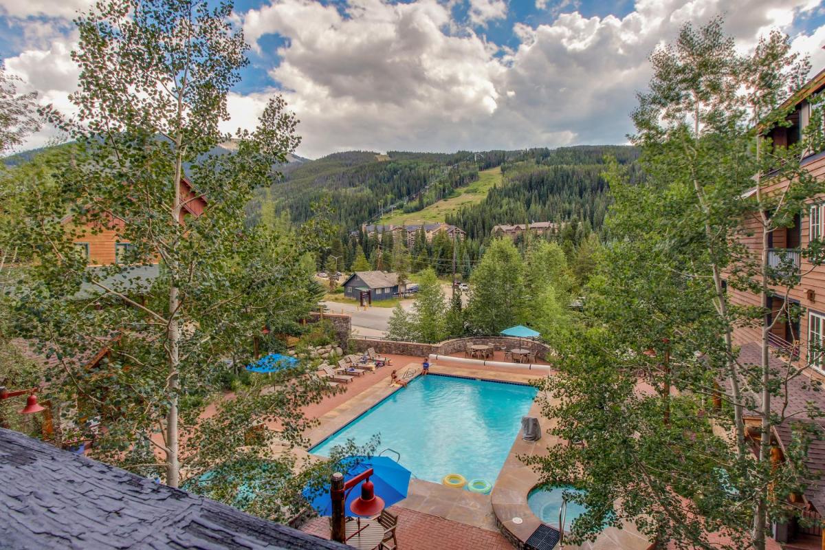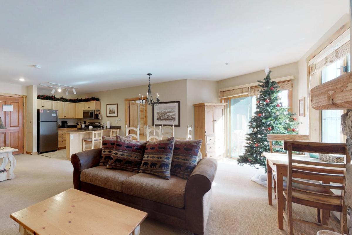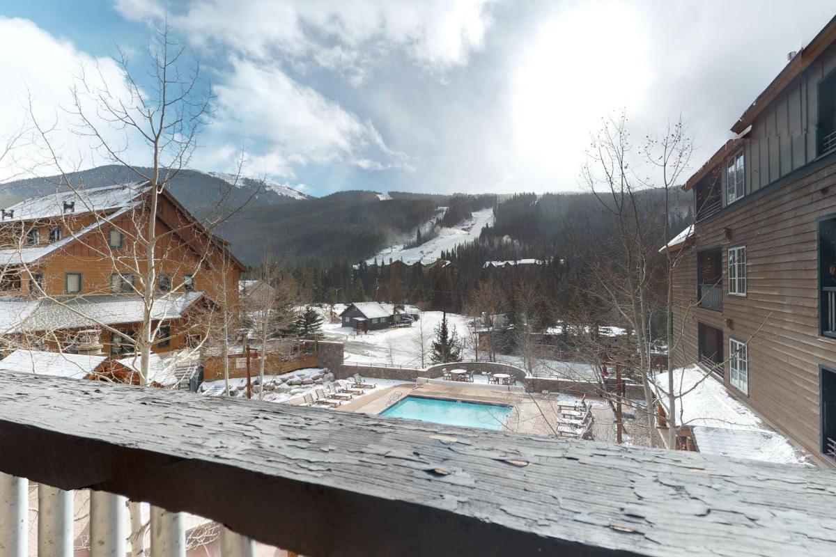 The gallery captures the relaxed atmosphere of this Keystone apartment — from its bright living room with a stone fireplace to the private balcony overlooking the mountains. Photos of the sauna and hot tub hint at the restful pace of evenings here, while the outdoor pool gleams under Colorado’s blue skies. Interiors show modern furnishings, a well-appointed kitchen, and warm lighting that complements the rustic charm of the surrounding forests.