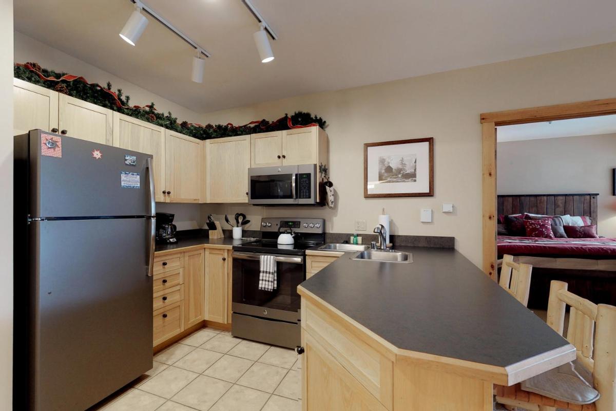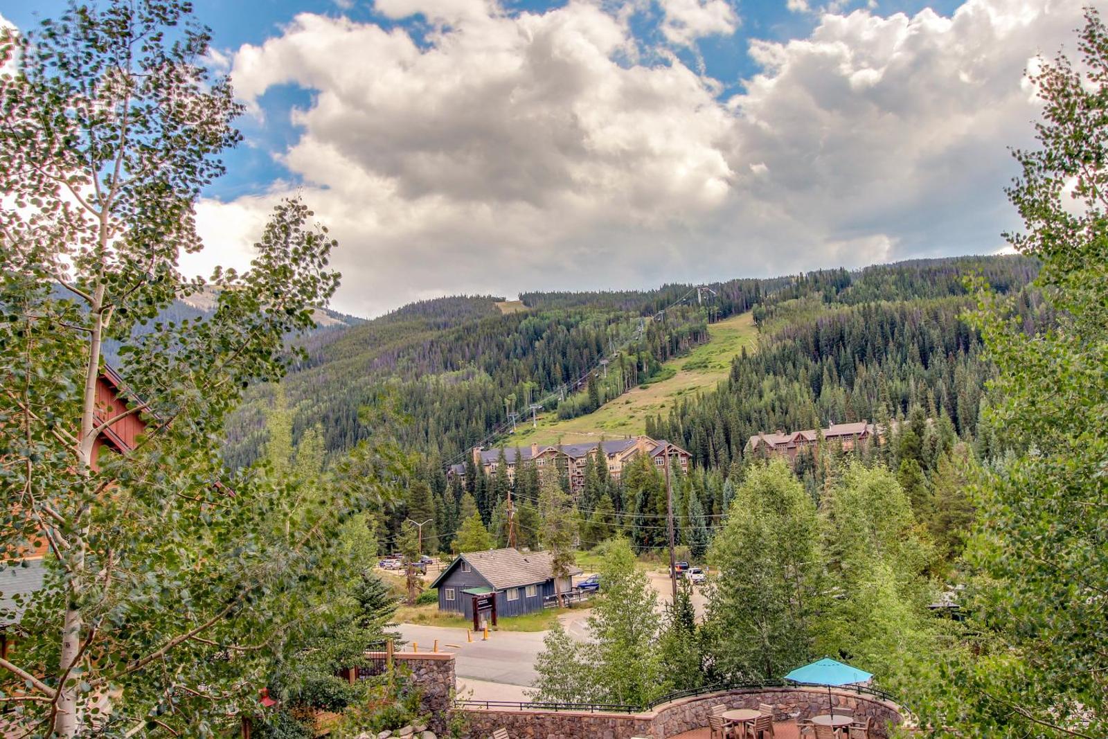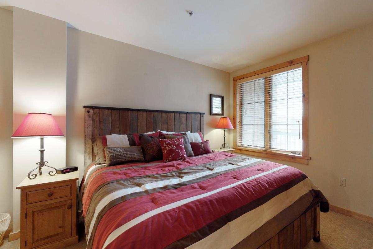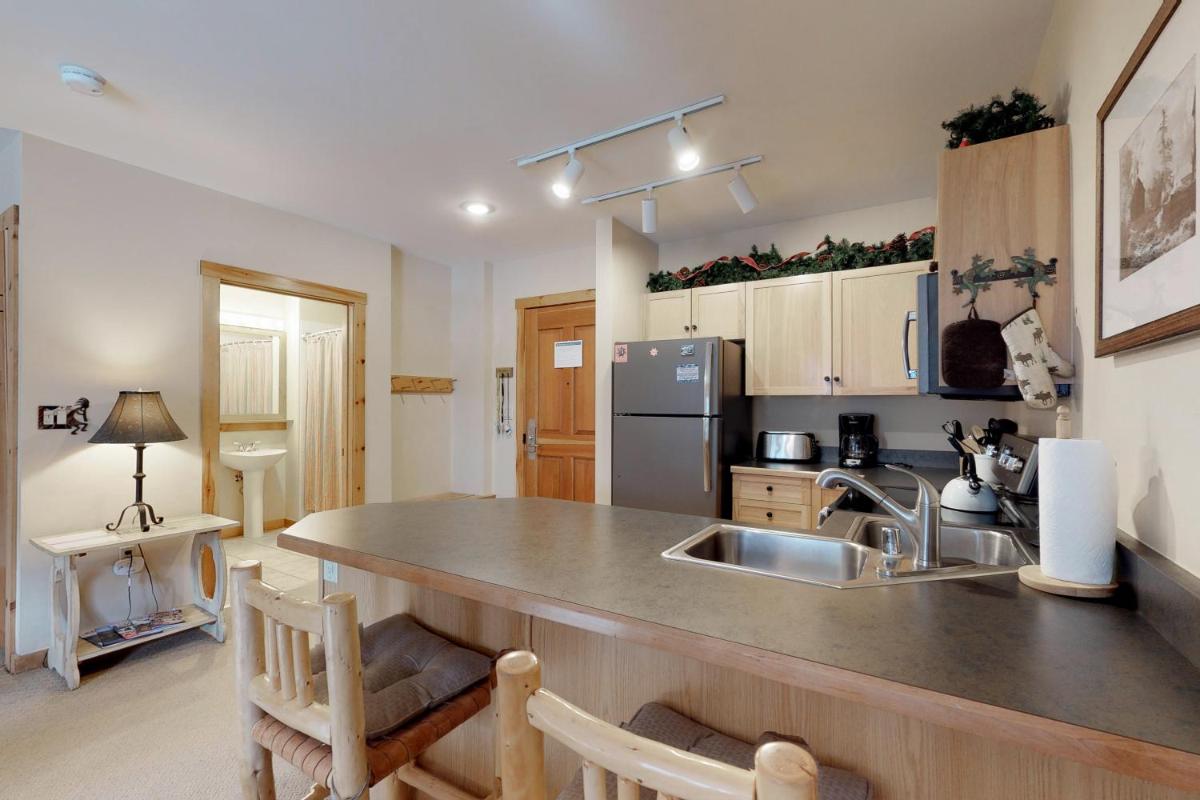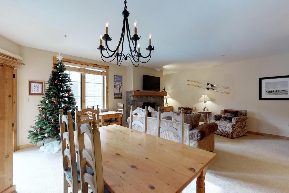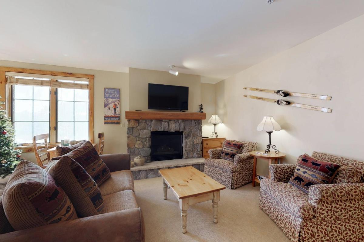 The gallery captures the relaxed atmosphere of this Keystone apartment — from its bright living room with a stone fireplace to the private balcony overlooking the mountains. Photos of the sauna and hot tub hint at the restful pace of evenings here, while the outdoor pool gleams under Colorado’s blue skies. Interiors show modern furnishings, a well-appointed kitchen, and warm lighting that complements the rustic charm of the surrounding forests.