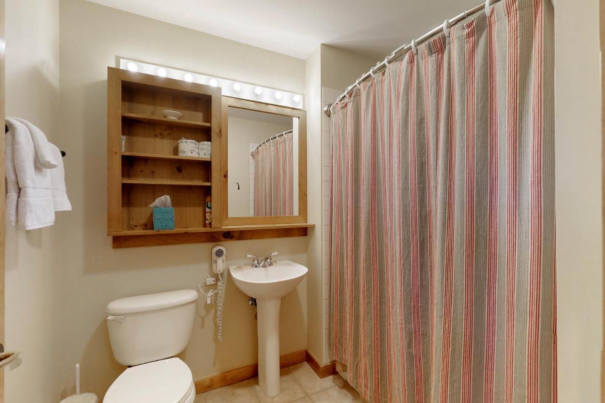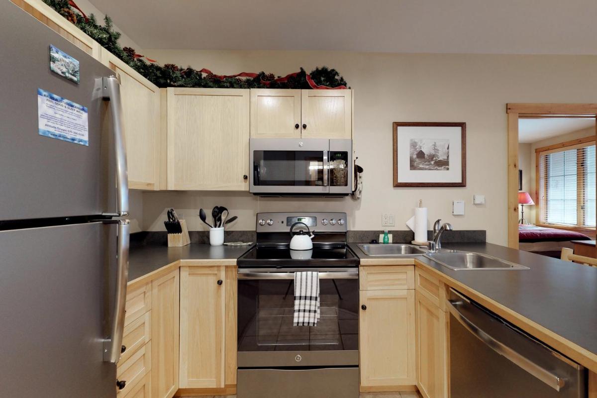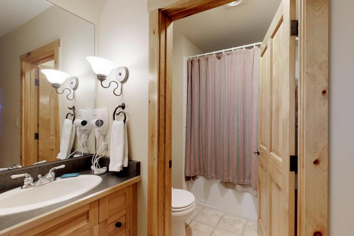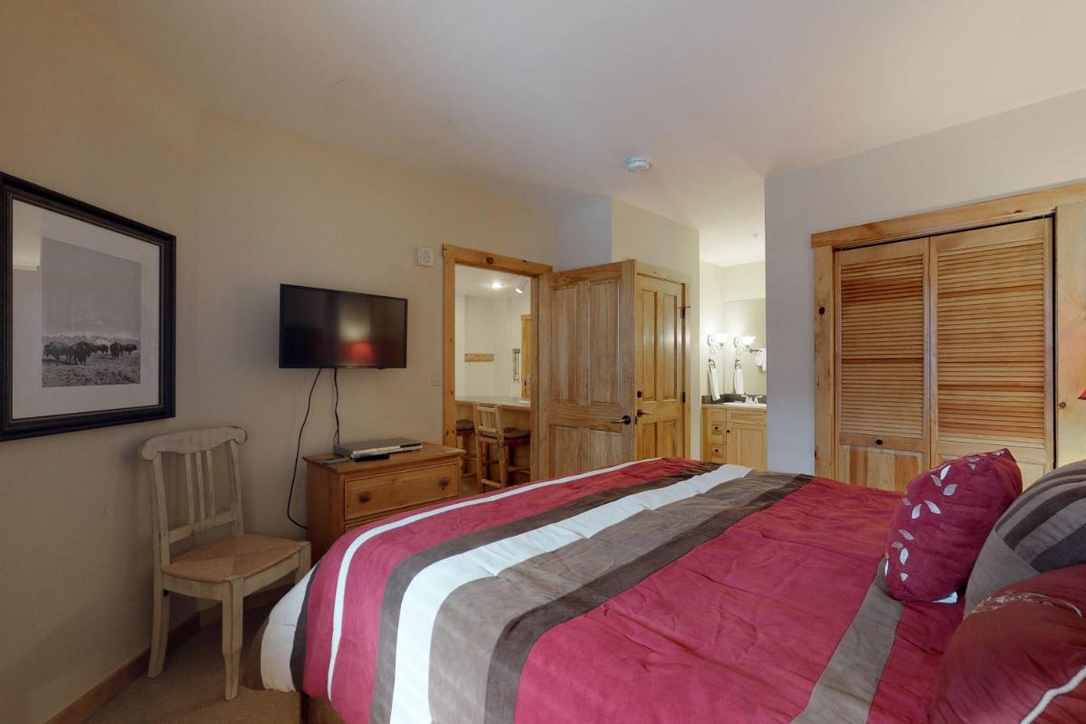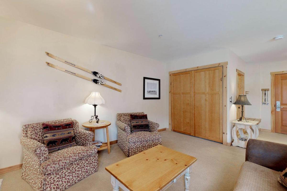 The gallery captures the relaxed atmosphere of this Keystone apartment — from its bright living room with a stone fireplace to the private balcony overlooking the mountains. Photos of the sauna and hot tub hint at the restful pace of evenings here, while the outdoor pool gleams under Colorado’s blue skies. Interiors show modern furnishings, a well-appointed kitchen, and warm lighting that complements the rustic charm of the surrounding forests.